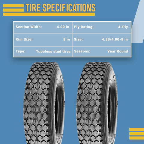 2 New 4.80/4.00-8 Stud Tires – Tubeless