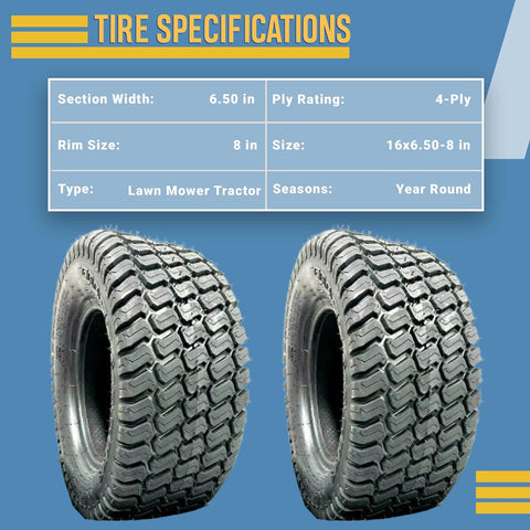 Two- 16x6.50-8 Lawn Tractor Turf Style 4 Ply Rated Heavy Duty 16x6.50-8 Nhs, 4 Ply Rated Heavy-Duty Design for Superior Performance on Grass Surfaces, Compatible with 16x6.50-8 Nhs