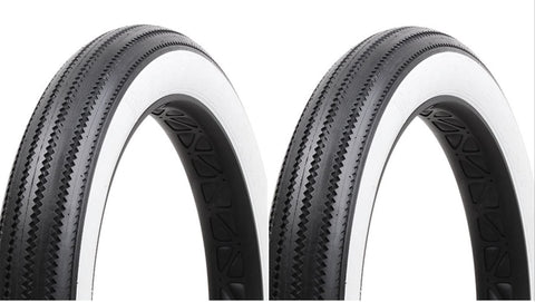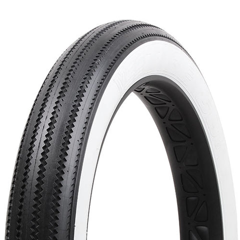 This is a 26x4.0 White Wall Vee Tire Zig Zag Bicycle Tire. The Zig-Zag has a unique style compared other fat tires. With its straight-line knobs, you can match your old classic style bicycle with a modern lifestyle that meets for design of beach bike, cruiser bike, bobber, cafe? racer or speedway rider. No matter, if you want to ride fast or slow, this tire is a true show-stopper!l. Vee Tire has been a leading manufacturer of high quality bicycle tires and tubes since 1977. Produced in Thailand, each of their products are carefully crafted with select raw materials using state of the art modern technologies giving Vee Tire a leading edge over the cheaper low cost products on the market. Ride with confidence and Ride Safe with Vee Tire! Features: